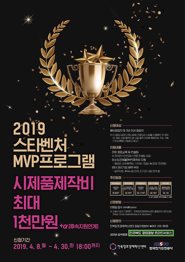 □ 한국전기안전공사는 16일, 전북창조경제혁신센터가 추진하는 ‘2019 스타벤처 MVP 프로그램’ 사업에 참여한다고 밝혔다.