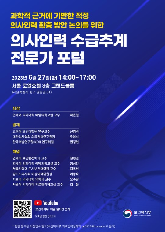 보건복지부(장관 조규홍)는 6월 27일(화) 오후 2시 서울 로얄호텔에서 과학적 근거에 기반한 적정 의사인력 확충 방안 논의를 위한「의사인력 수급추계 전문가 포럼」을 개최하였다.